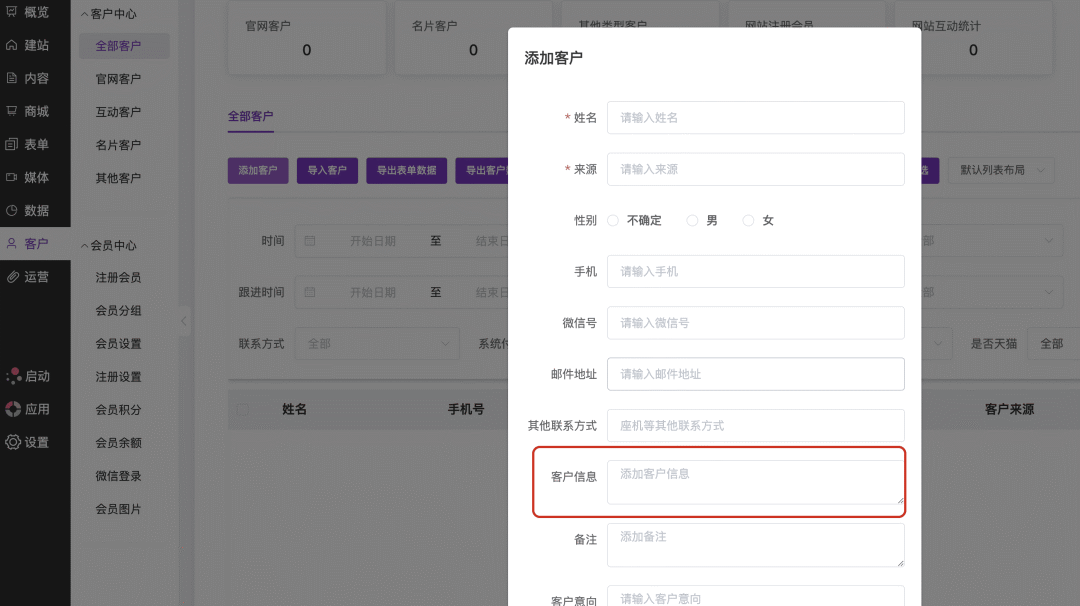点击「添加客户」,在弹出的表单中填写姓名、手机等必填信息。向下滚动,在「客户信息」字段处,填写该客户的背景、来源或初始需求(如“朋友推荐,对A产品感兴趣”),然后保存。