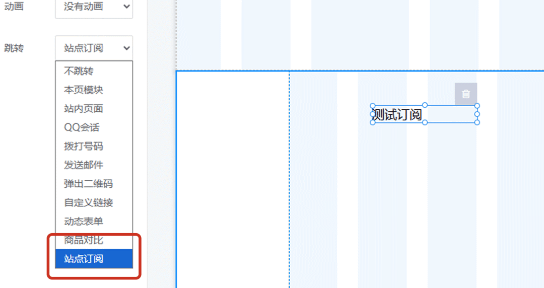 点击“跳转”事件的下拉菜单,在列表中找到并选择“站点订阅”选项。此操作将点击行为绑定至订阅弹窗。