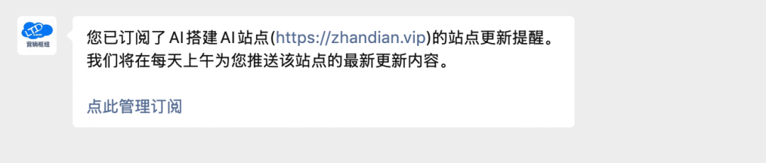 用户阅读通知,快速获取三个核心信息:①订阅的站点与网址;②内容推送的时间(如每天上午);③“点此管理订阅”的可操作链接。