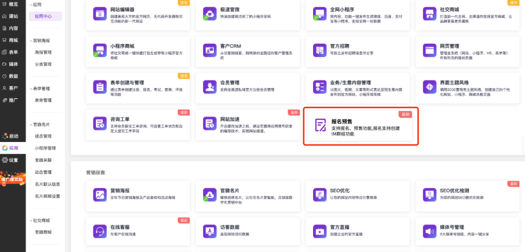 登录官微中心,依次进入「应用」 -> 「应用中心」,在应用列表中找到并点击“报名预售”应用。
