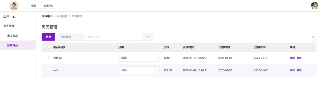 图示为进入“报名预售”应用后的“预售商品”管理主界面。顶部有“新建”按钮和搜索框。下方表格清晰列出了所有已创建的预售商品,包括商品名称(如“预售12”)、分类、价格、创建时间、开始/过期时间等关键信息,并提供“编辑”、“删除”操作。