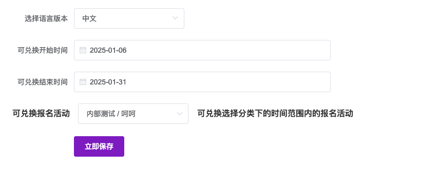 图示为添加或编辑预售商品时,配置兑换规则的界面。包含“可兑换开始时间”、“可兑换结束时间”的日期选择,以及“可兑换报名活动”的下拉选择框(示例中选中“内部测试 / 呵呵”),并配有规则说明。配置完成后,点击“立即保存”按钮生效。