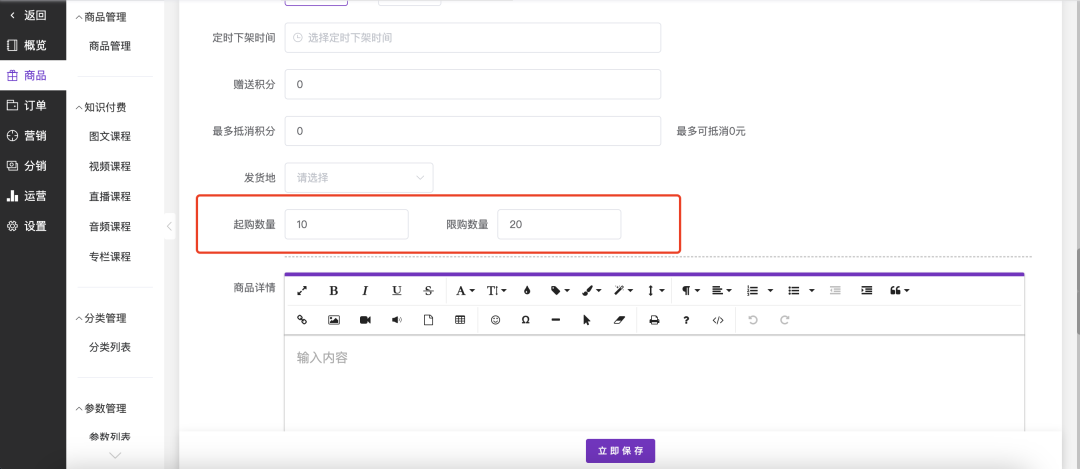 在商品编辑表单中,找到“商品信息”或类似区域,定位“起购数量”和“限购数量”的输入框(通常位于价格、库存等基础信息附近)。