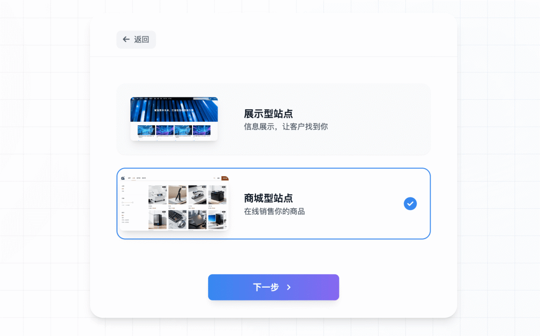 点击目标卡片(如“商城型站点”),卡片将呈现选中状态(显示蓝色对勾)。确认选择无误。