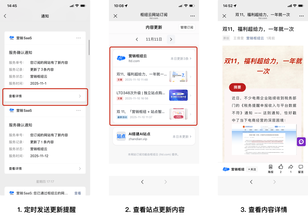 系统每日自动汇总订阅站点在“文章、视频、常见问题”等方面的更新内容,于次日上午9点左右通过“营销SaaS”公众号的服务消息,统一推送给所有订阅用户。一条消息清晰展示更新条目数与状态,点击“查看详情”可浏览聚合内容列表。