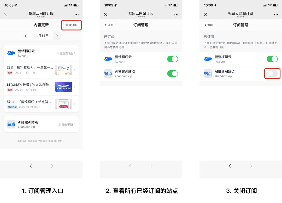 用户可通过公众号菜单进入“订阅管理”页,随时开启或关闭对特定站点的订阅。