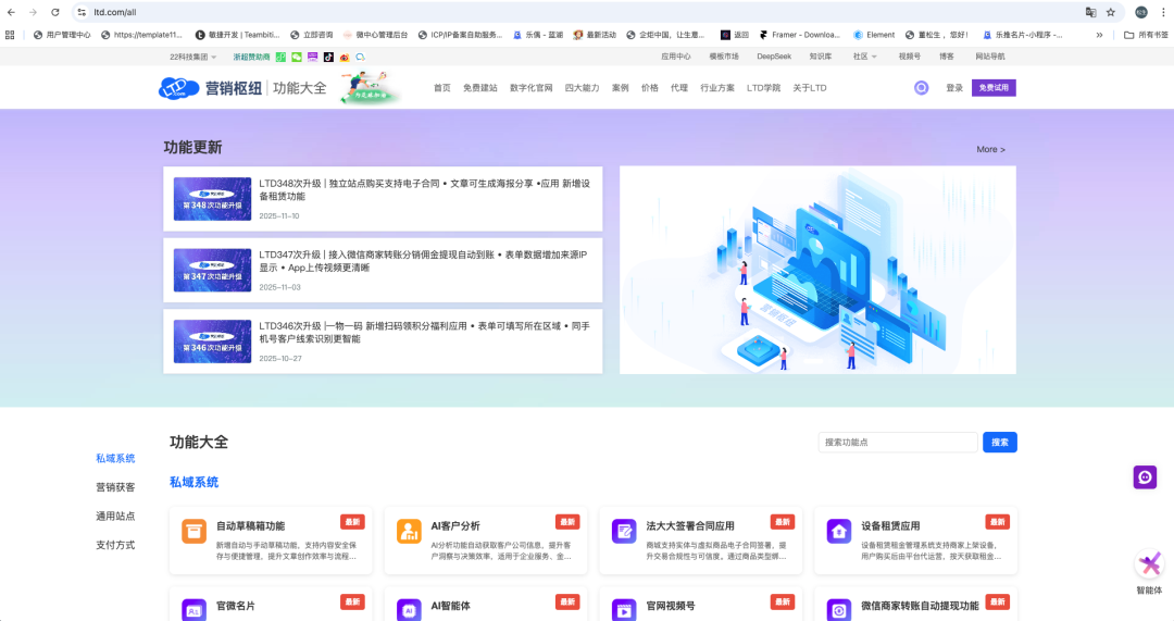 用户在浏览器输入ltd.com/all,或通过官网导航访问“营销枢纽系统功能大全”页面。