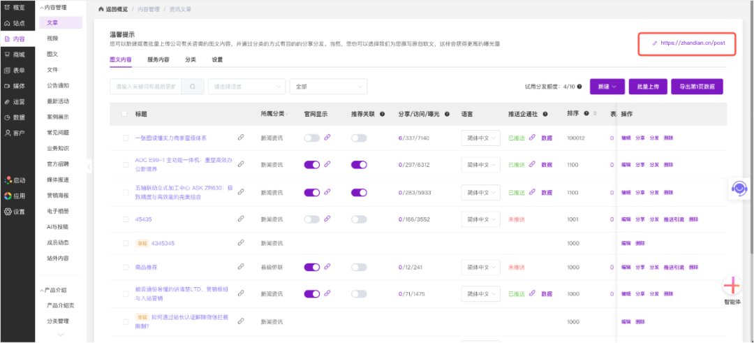 固定、语义化的路径(如/post, /vlog)易于记忆。后台一键复制链接,分享路径极简,极大提升了运营人员的操作效率与传播便利性。