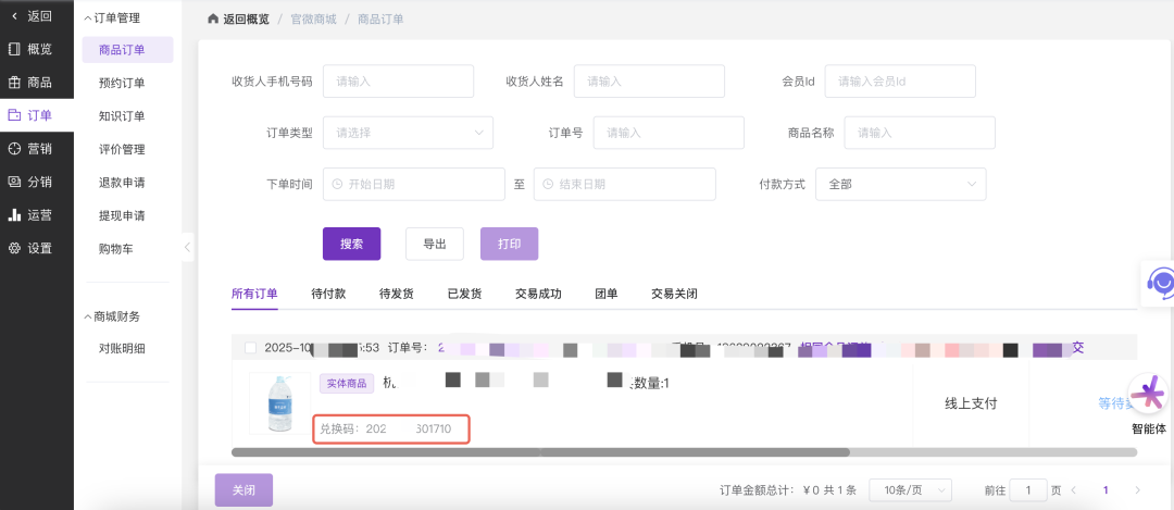 提供多维订单筛选与搜索功能,可按状态、订单号、手机号等快速定位。列表页集中展示商品、订单、支付、收货人及兑换码等核心信息,实现一站式高效管理。