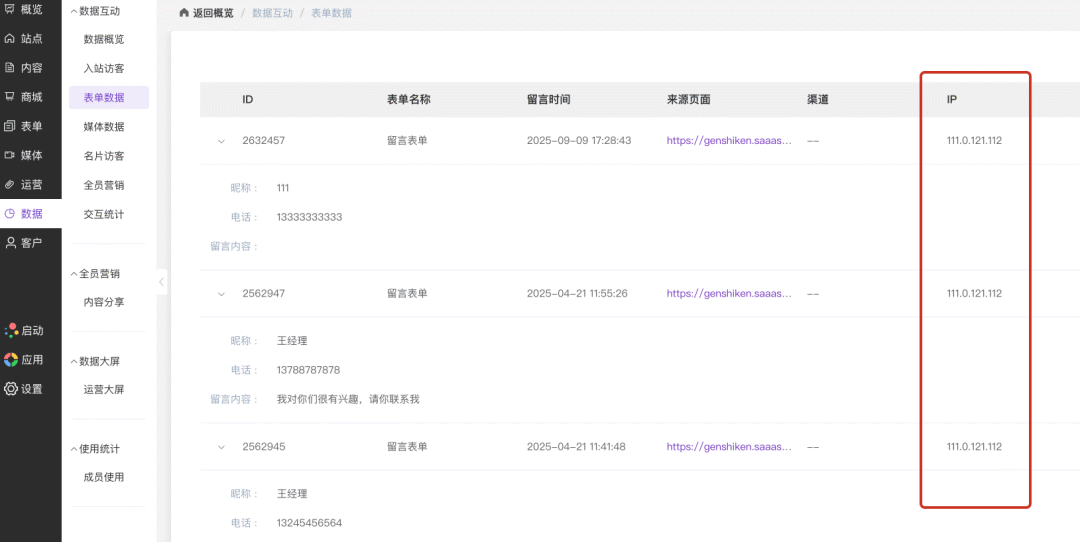 IP作为数据列表的固定列,查看路径与查看电话、留言等信息完全一致,集成在管理后台,学习成本为零,告别繁琐的日志查询或技术求助。