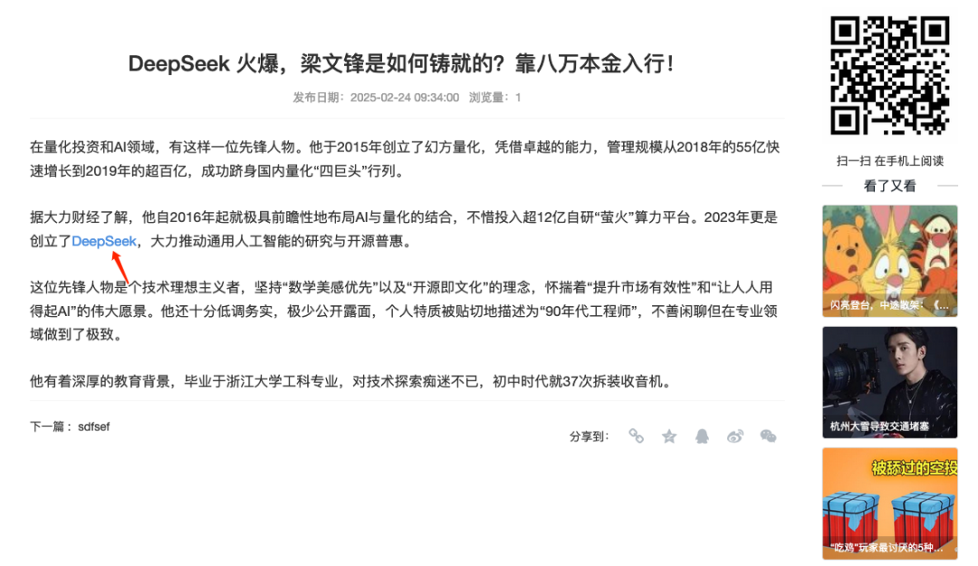 此图展示了该功能在前台的实际效果。在一篇标题为“DeepSeek 火爆,梁文锋是如何铸就的?”的文章正文中,关键词“DeepSeek”已被系统自动识别,并添加了下划线,表明其已变为一个可点击的超链接。用户点击后,将跳转到后台为该关键词预设的目标页面(例如公司介绍页或相关专题页)。