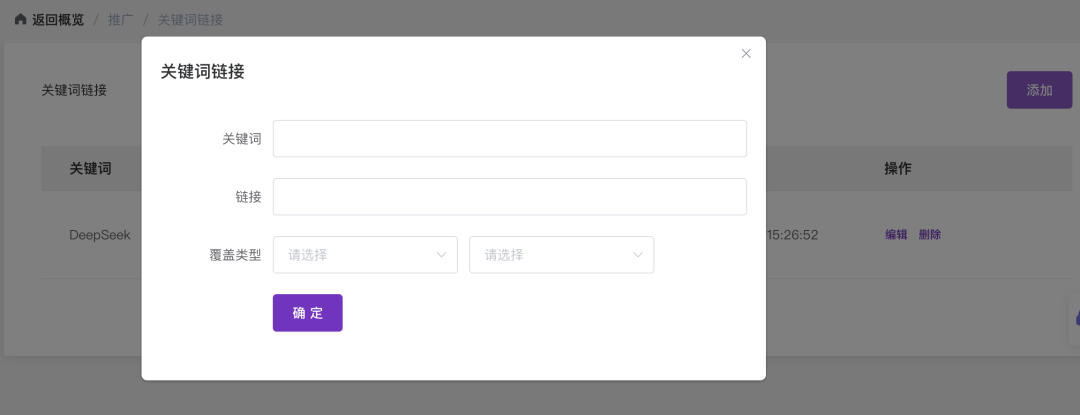 此图展示了点击“添加”或“编辑”后弹出的配置窗口。窗口标题为“关键词链接”。用户需要填写三个核心字段:1. 关键词:输入需要被自动链接的文本(如DeepSeek)。2. 链接:输入该关键词点击后需要跳转的目标网址。3. 覆盖类型:通过下拉菜单选择此规则对哪些内容类型生效(如文章、视频等),支持多选。填写完毕后,点击紫色“确定”按钮保存。