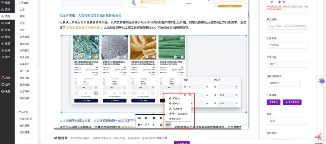 在文章内容编辑器中,新增图片宽度统一设置功能,提供预定义的小(300px)、中(650px)、大(1024px)、全尺寸(1024px)以及100%宽度选项,可一键应用于编辑器内的所有图片,实现快速统一排版。