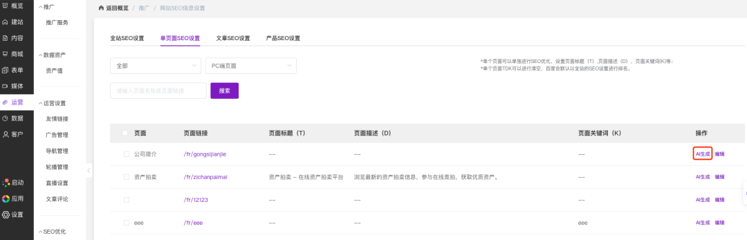 在页面列表中,找到需要生成或优化TDK的页面(如“公司简介”)。点击该行“操作”列下的紫色「AI生成」按钮。