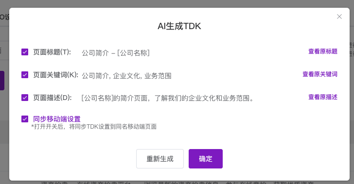截图展示了点击“AI生成”后弹出的“AI生成TDK”功能窗口。窗口清晰分为三部分:页面标题(T)、页面关键词(K)、页面描述(D)。每部分左侧有勾选框(默认全选),右侧有“查看原标题/原关键词/原描述”的链接按钮,用于新旧对比。中间展示AI生成的内容示例,如标题“公司简介-[公司名称]”。底部有“同步移动端设置”开关及说明,以及“重新生成”和紫色的“确定”按钮,方便用户调整和确认。