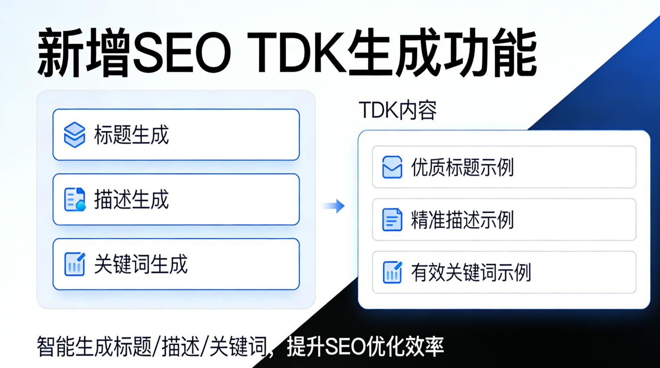 | 企业官网与品牌站 | 运营人员为“关于我们”、“产品中心”、“新闻动态”等数十个页面批量生成或优化TDK,确保每个页面都有符合搜索引擎规范且吸引点击的标题和描述,提升整体站点的搜索可见性。 | 某制造企业:全站核心页面TDK覆盖率从30%提升至100%,自然搜索流量增长40% |