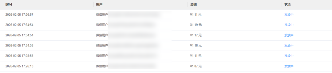 展示了红包发放的详细记录列表,包含时间、用户、随机金额(1.07-1.19元)、发放状态。用于监控功能使用情况、资金消耗及效果复盘。