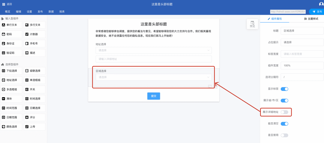 在右侧“组件属性”面板中,找到“展示详细地址”开关。根据业务需求,如需收集详细地址则保持开启(默认);如仅需区域信息,则将其切换为“关闭”状态。