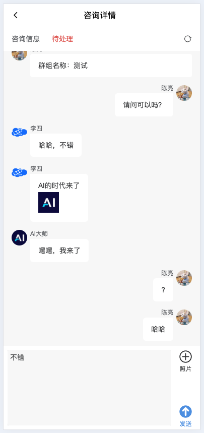 (基于第1张图)展示了用户端的群组聊天室界面。顶部显示“咨询详情”及“待处理”状态,群组名为“测试”。界面中部为聊天记录,包含不同用户(陈亮、李四、AI大师)发送的文字消息及AI图标。底部为消息输入框,右侧有“照片”和“发送”按钮,支持发送图片和文字消息。