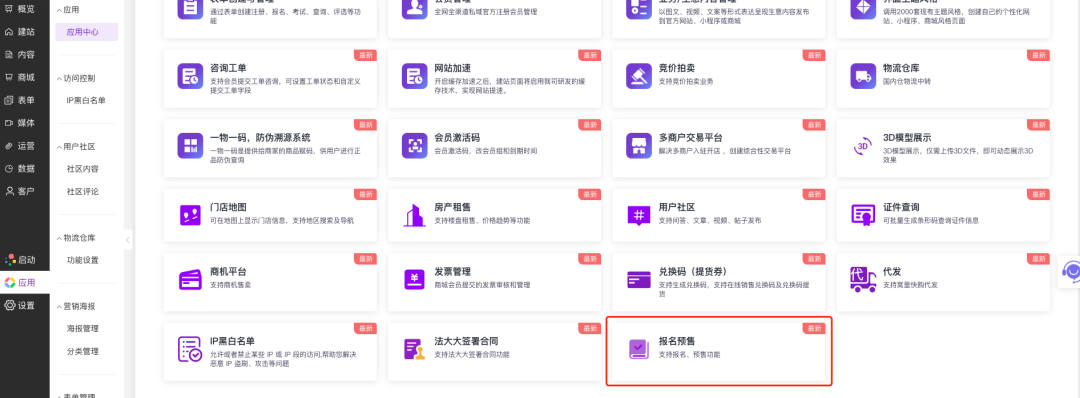 (基于第5张图)再次展示了“应用中心”,其中“报名预售”应用被红框标注,其功能描述为“支持报名、预售合同功能,报名支持创建IM群组功能”,明确了该应用与群组功能的集成关系。