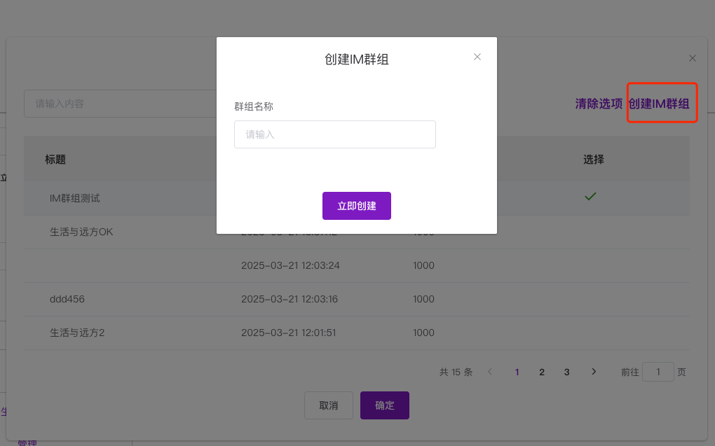 (基于第6张图)展示了“创建IM群组”的弹窗界面。弹窗标题明确,包含“群组名称”输入框和紫色的“立即创建”按钮,操作简单直接。