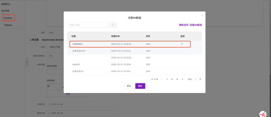 在“报名预售”应用中添加商品时,可直接“关联IM群组”。支持从现有群组列表中选择,或一键“创建IM群组”,实现商品售卖与专属服务群组的无缝绑定,简化运营流程。