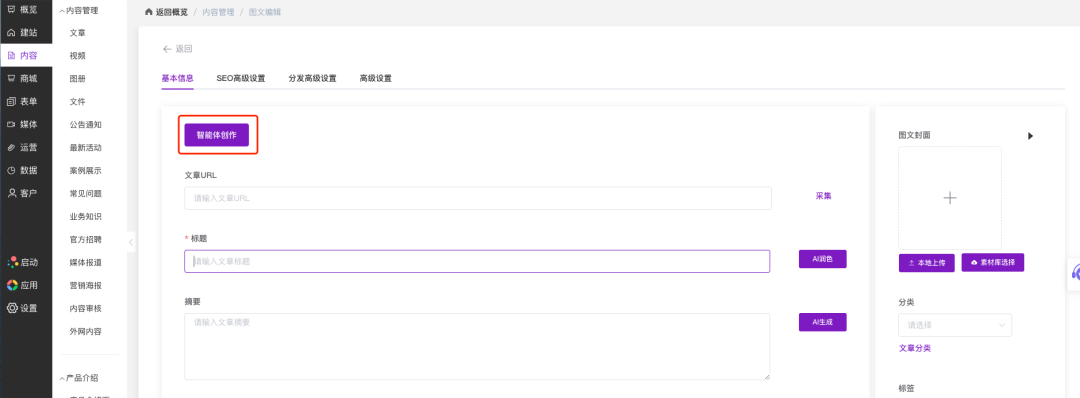 (基于第1张图)展示了新建/编辑文章的图文编辑页面。顶部有“基本信息”、“SEO高级设置”等选项卡。页面中部靠上位置,紫色按钮“智能体创作”被红框醒目标注。下方是文章URL、标题、摘要等常规输入框,右侧是图文封面、分类、标签等设置区域。清晰地展示了“智能体创作”作为高级创作模式的入口位置。