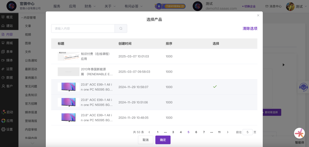 (基于第5张图)展示了点击“选择产品”后弹出的产品选择窗口。窗口标题为“选择产品”,顶部有搜索框。下方列表展示了所有产品,包含标题、创建时间、排序等信息。用户可在此选择一款具体产品,其信息(如图片、参数)将作为智能体创作的核心素材。