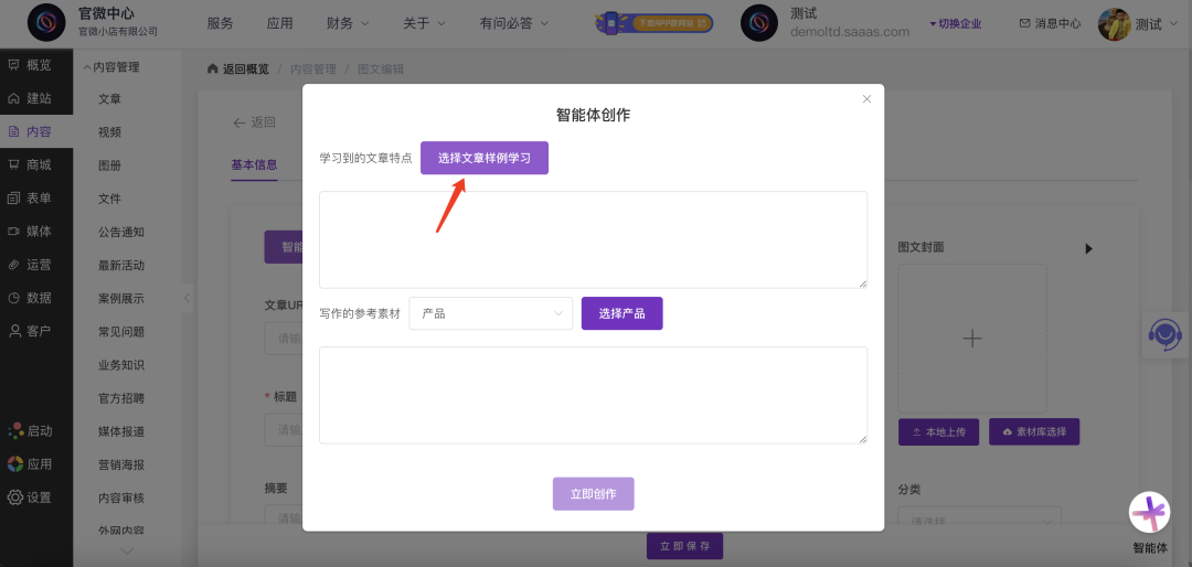 登录官微中心,进入「文章」模块,点击「新建」文章。在打开的图文编辑页面,点击顶部的紫色「智能体创作」按钮。