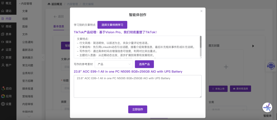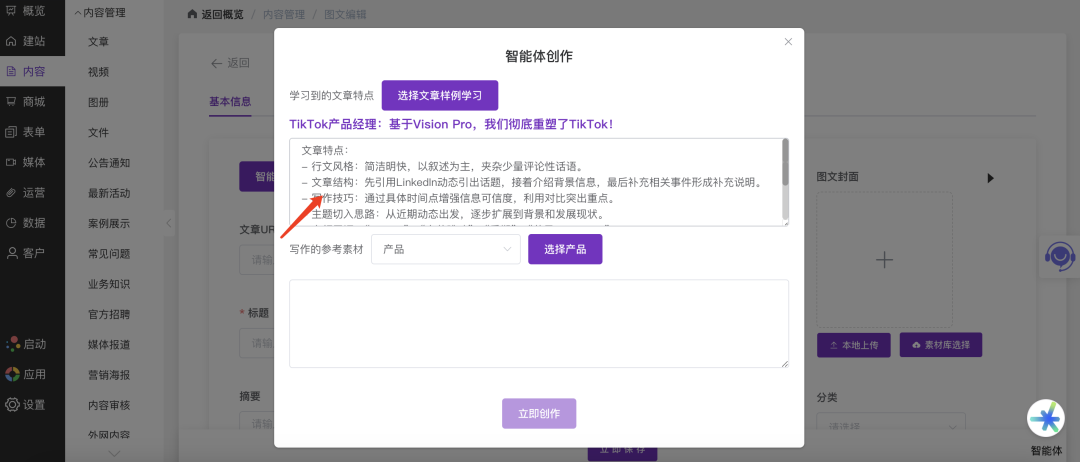 | 科技媒体与产品评测 | 编辑选择一篇优秀的深度评测文章作为“样例”,然后选择最新发布的“智能手机”作为“参考素材”。智能体自动生成一篇结构相似、风格专业、数据准确的新品评测初稿,编辑稍作修改即可发布。 | 某科技媒体:单篇产品评测文章创作时间从4小时缩短至30分钟,内容输出频率提升300% |