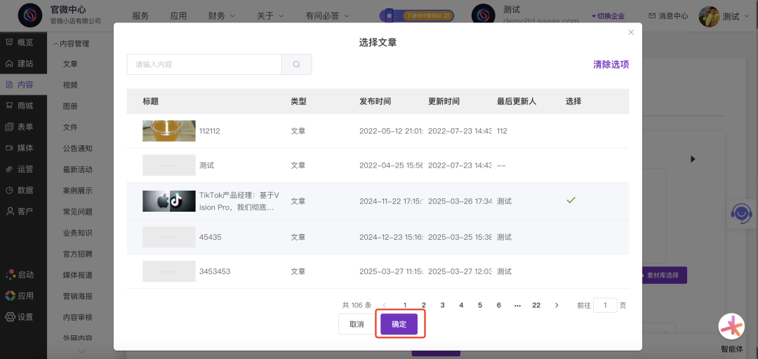 (基于第3张图)展示了点击“选择文章样例学习”后弹出的文章选择窗口。窗口标题为“选择文章”,提供搜索和清除选项功能。下方以表格形式清晰列出了站内所有历史文章,包含标题、类型、发布时间、最后更新人等信息,每行有勾选框。用户可在此浏览并选择一篇高质量文章作为风格学习的范本。