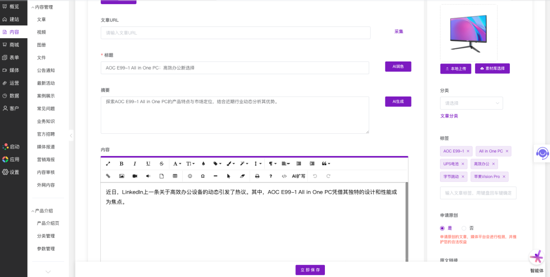 (基于第7张图)展示了智能体“立即创作”完成后,自动将生成内容填充到文章编辑器的效果。可以看到,“标题”输入框已被填入AI生成的文章标题(如包含“AOC E99-1”等关键词)。“摘要”框内已有AI生成的摘要。“内容”编辑区已填充了完整的AI生成正文,开头模仿了范文的“引用动态”风格。“图文封面”区域自动使用了所选产品的图片。“分类”和“标签”也已自动设置。用户可在此界面上直接进行修改和完善。