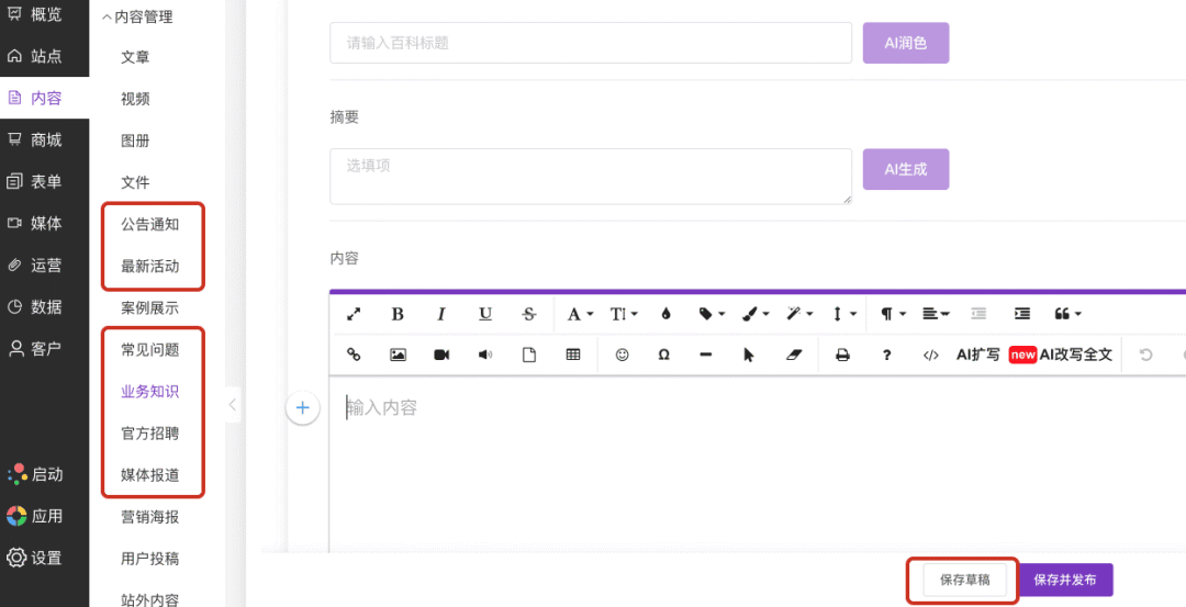 截图展示了内容编辑界面。左侧导航栏中,“公告通知”、“最新活动”、“常见问题”、“业务知识”等多种内容类型被红框突出,表明它们均已支持草稿功能。编辑区底部提供统一的“保存草稿”和“保存并发布”按钮。页面还集成了“AI润色”、“AI生成”、“AI改写全文”等辅助创作功能按钮。