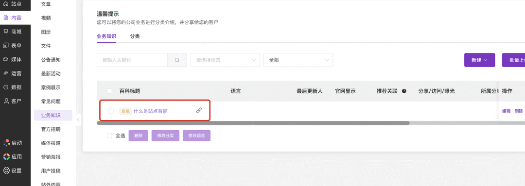 登录后台,在左侧导航栏中选择需要创建内容的具体类型,如“业务知识”、“最新活动”等。