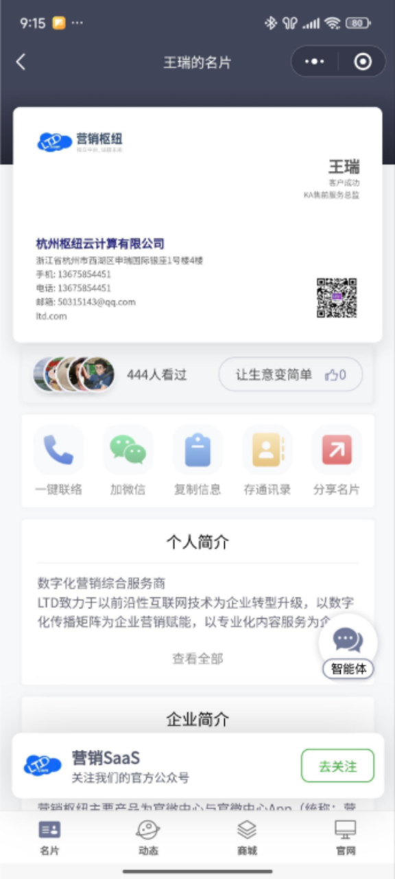 完成步骤1的全局配置后,系统会自动将已激活的AI智能体功能集成到所有成员的官微名片公共版页面中。成员无需额外操作。