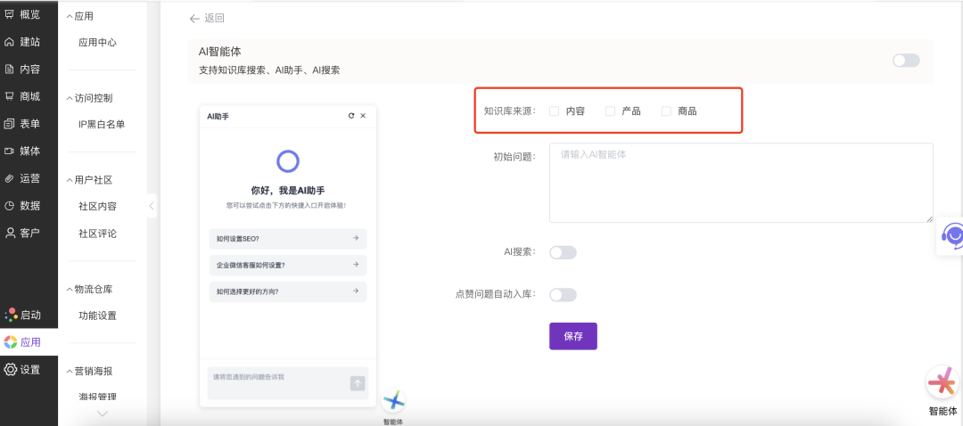 (对应第3张图)此图展示了官微中心后台的“AI智能体”统一配置界面。管理员在此可进行全局设置,包括:开启/关闭功能、选择“知识库来源”(如内容、产品、商品)、配置AI助手的“初始问题”、管理“点赞问题自动入库”等。这是驱动官网和名片智能体“大脑”的核心控制台。