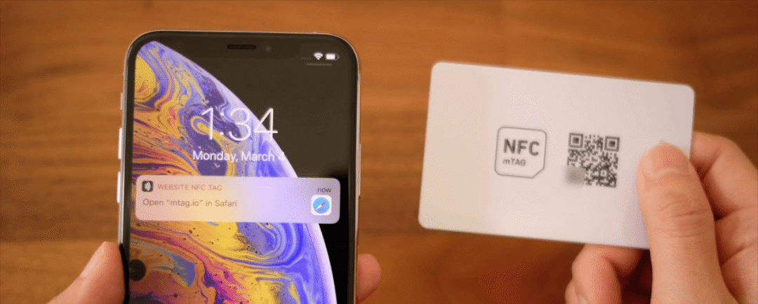 (基于您提供的图片描述)此图清晰地演示了NFC名片技术的应用场景。画面中,一部智能手机(屏幕显示类似iPhone锁屏界面)接收到一个来自NFC卡片的通知,提示“Open 'mtag.io' in Safari”。另一只手手持一张印有“NFC mTAG”字样的白色NFC卡片。这个场景直观展示了手机通过NFC感应,直接从物理卡片上读取信息并触发相应动作(打开网页/应用)的过程,完美诠释了“碰一碰交换名片”的功能理念。