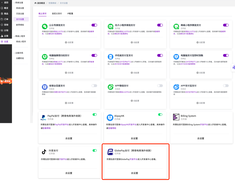 (对应您提供的第1张图)此图展示了“支付设置”的主界面。左侧为深色导航栏,包含商城、商品、订单、设置等模块。右侧主区域以卡片形式列出了所有支付方式,包括“公众号微信支付”、“微信支付”、“GlobePay支付(跨境电商海外收款)”等。其中“GlobePay支付”卡片清晰展示了其功能描述、已开启状态以及一个醒目的蓝色“去设置”按钮,方便用户快速进入详细配置。