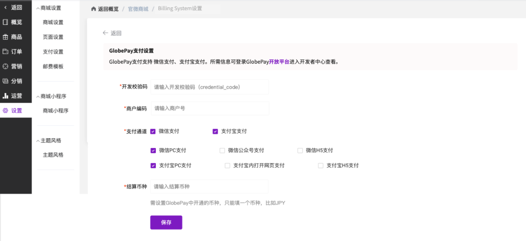 在配置界面中,填写获取的“开发校验码”和“商户编码”。在“支付通道”中勾选您希望开通的支付方式(如微信支付、支付宝支付)。在“结算币种”中输入您在GlobePay开通的币种,例如“JPY”或“CNY”。