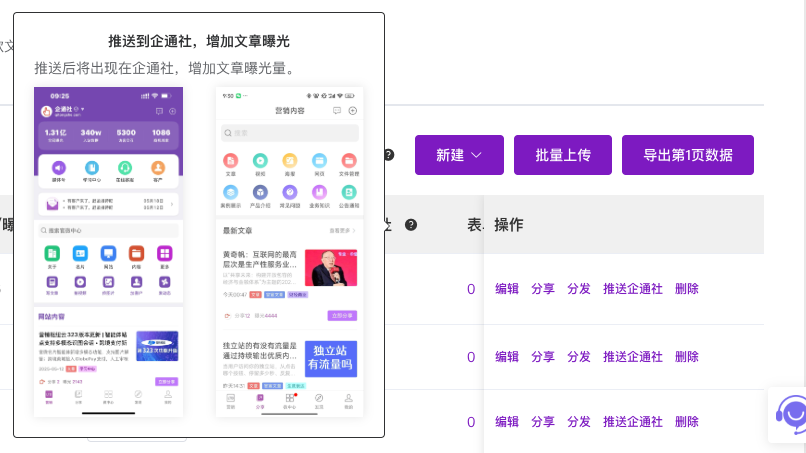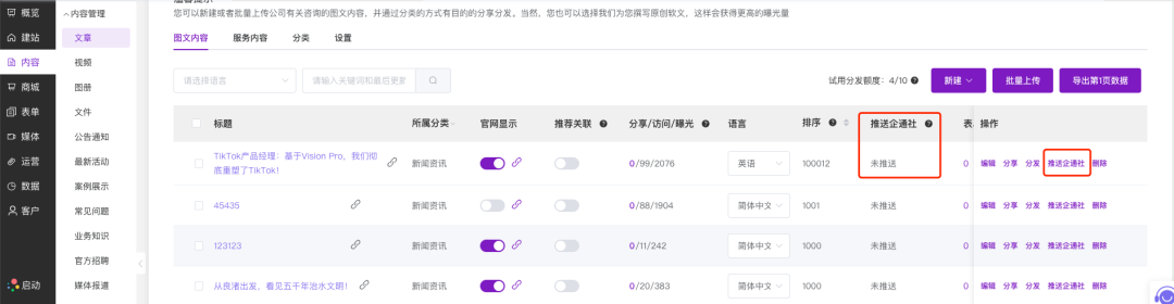 (对应您提供的第2张图)此图展示了内容管理后台的文章列表。在每篇文章的操作栏中,新增了醒目的“推送企通社”按钮。列表中还显示了推送状态(如“未推送”或“已推送”),方便管理员追踪内容分发情况。