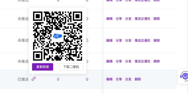 (对应您提供的第3张图)此图展示了点击“推送企通社”并成功后弹出的二维码弹窗。弹窗中央是企通社文章的访问二维码,下方提供“复制链接”和“下载二维码”两个按钮,方便用户快速获取分发素材。