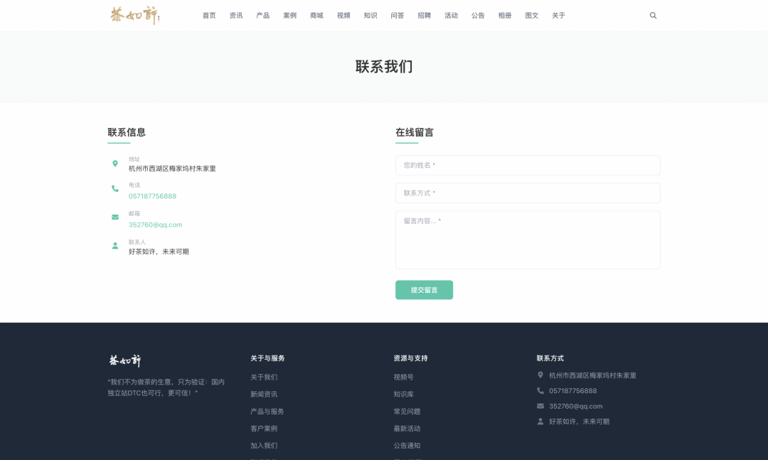 截图5:联系我们页面 - 一侧展示详细联系方式(地址、电话、邮箱),另一侧集成在线留言表单,便于访客提交咨询,线索直通后台。