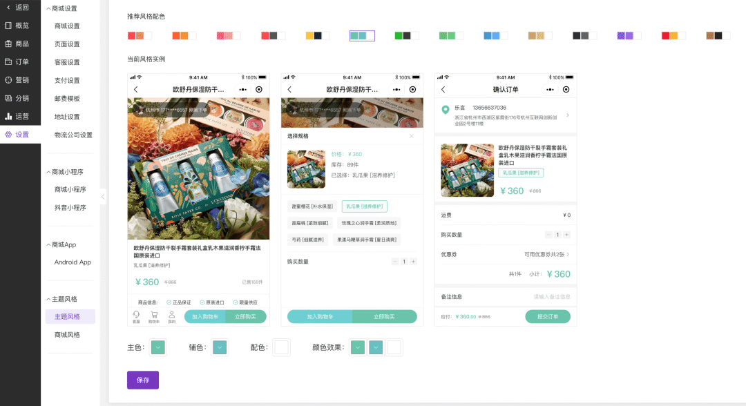 进入“后台 - 商城 - 设置 - 主题风格”,根据企业VI选择预设配色或自定义主色、辅色。保存后,通用站点视觉风格将同步更新。