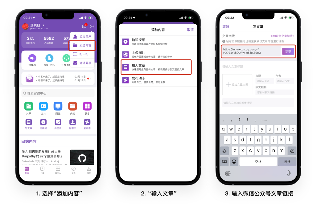 打开官微中心App,在首页或底部导航点击“添加内容”,在弹出的功能选项中选择“输入文章”,进入文章编辑/采集界面。