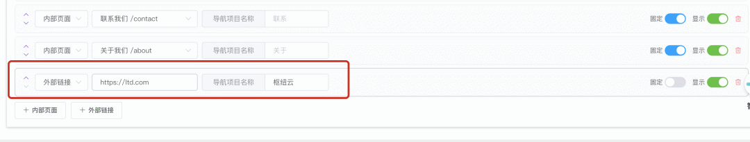 点击“+ 外部链接”,在弹出的界面中输入目标URL(如 https://ttd.com)和导航名称(如“枢纽云”),开启“显示”开关后保存。