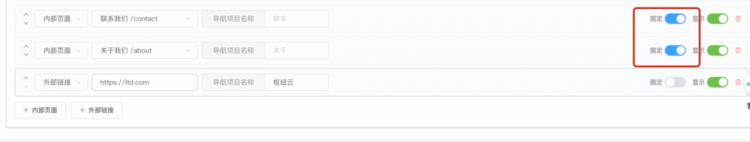 所有操作(重命名、显示/隐藏、排序、添加外链、设置固定)均在可视化界面完成,一键拖拽或开关即可生效,无需代码或复杂后台操作,管理成本极低。