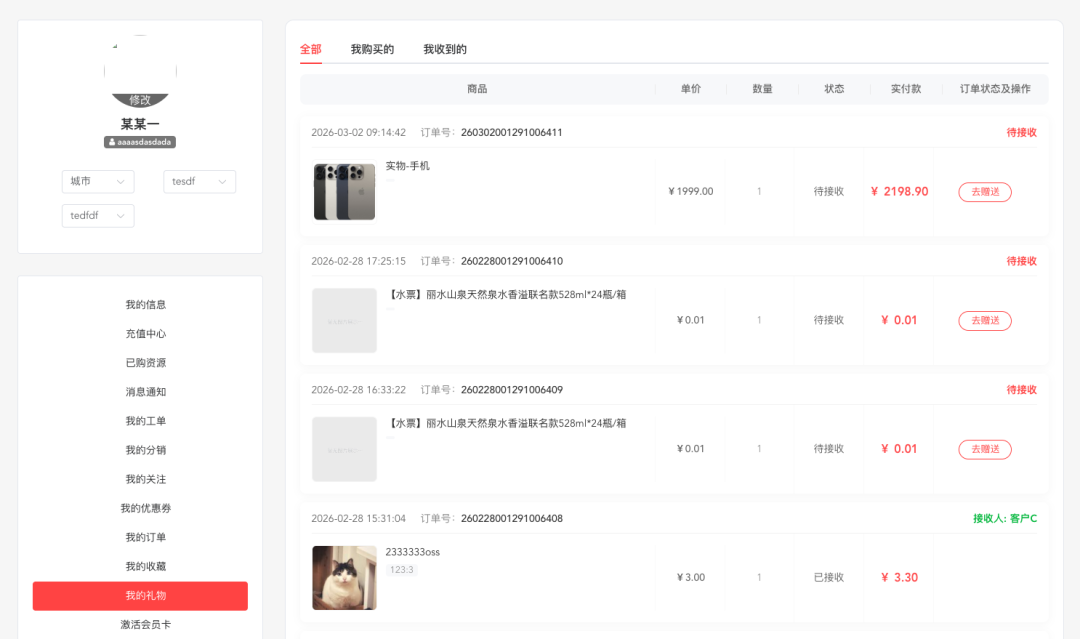 展示了送礼方查看“我的礼物”或“礼物管理”页面的界面,可清晰看到每条赠送记录的接收状态(如“待接收”、“已接收”),便于管理与追踪。