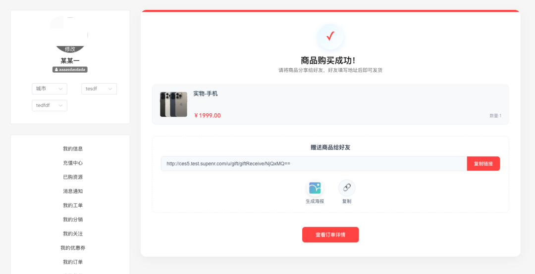 支付成功后,在订单成功页的“赠送商品给好友”模块,复制赠送链接或点击“生成海报”保存图片,将链接/海报分享给好友。