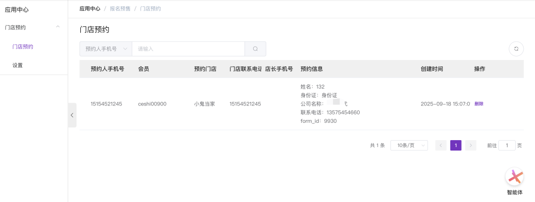 登录“官微中心”后台,导航至「应用中心」->「门店预约」。在默认的列表页中,可查看所有预约记录,并使用搜索框按“预约人手机号”快速定位特定订单。