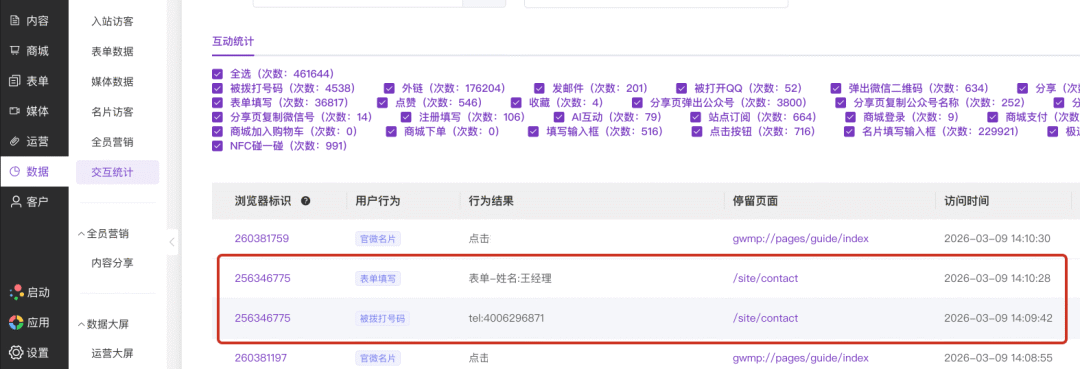 在交互统计列表页,可以查看包含“表单填写”和“被拨打号码”在内的所有交互记录。利用筛选、搜索功能,可以按时间、事件类型、页面等维度深入分析用户的高价值行为。